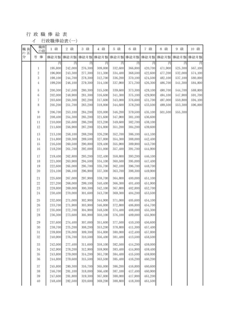 また、一般行政職(事務職)は【行政職俸級表(一)】、教職員は【教育職俸級表(一)】というように、職種によって適用される表が異なります。